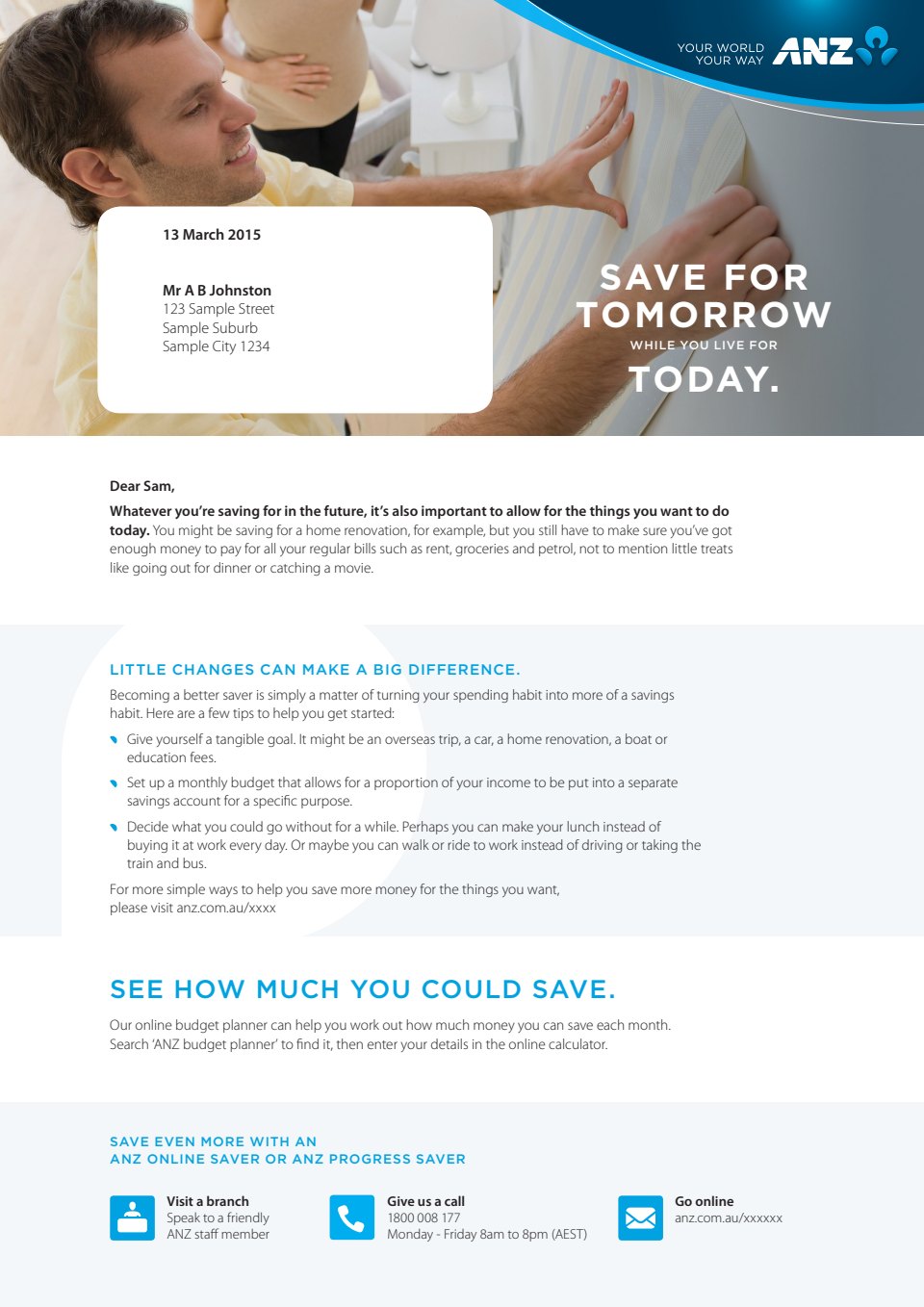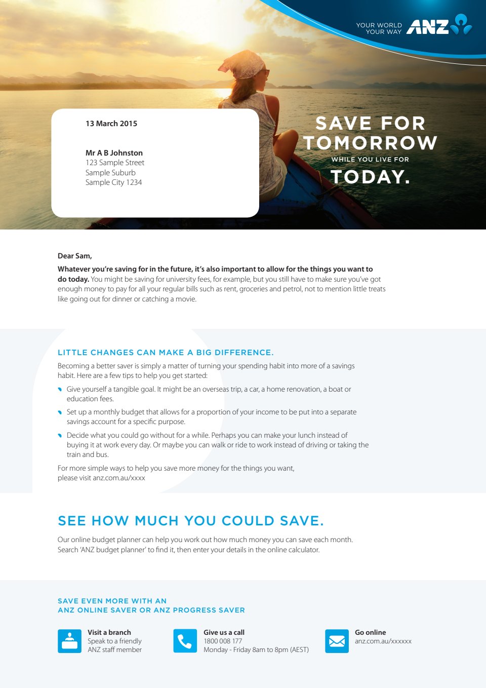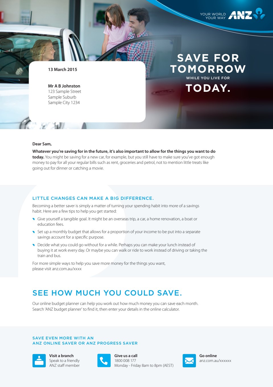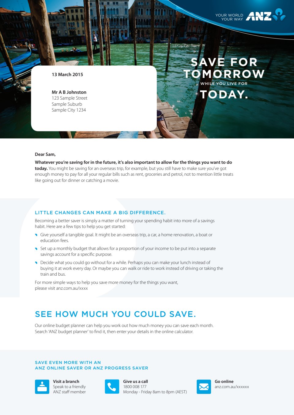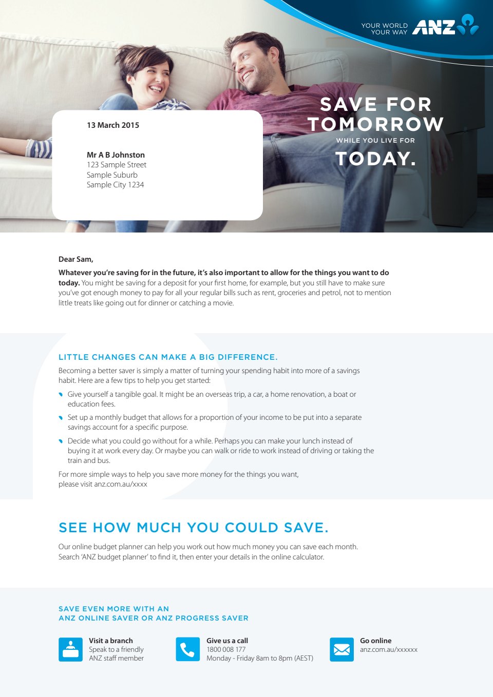 ANZ wanted to target customers who don’t have savings accounts and tell them about the benefits of saving, while continuing to enjoy every day pleasures. The campaign was highly segmented, allowing the copy and visuals to be tailored specifically to each target group