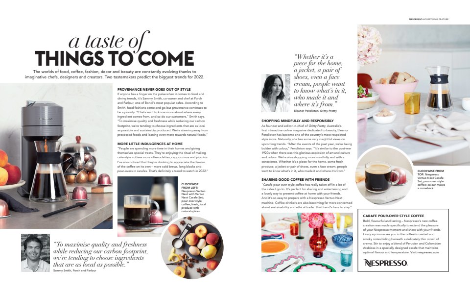 In this branded video and supporting advertorials for Nespresso, style icon and Gritty Pretty founder Eleanor Pendleton shares her thoughts on the latest trends in home entertaining, including carafe-style coffee made with Nespresso’s Vertuo machine.