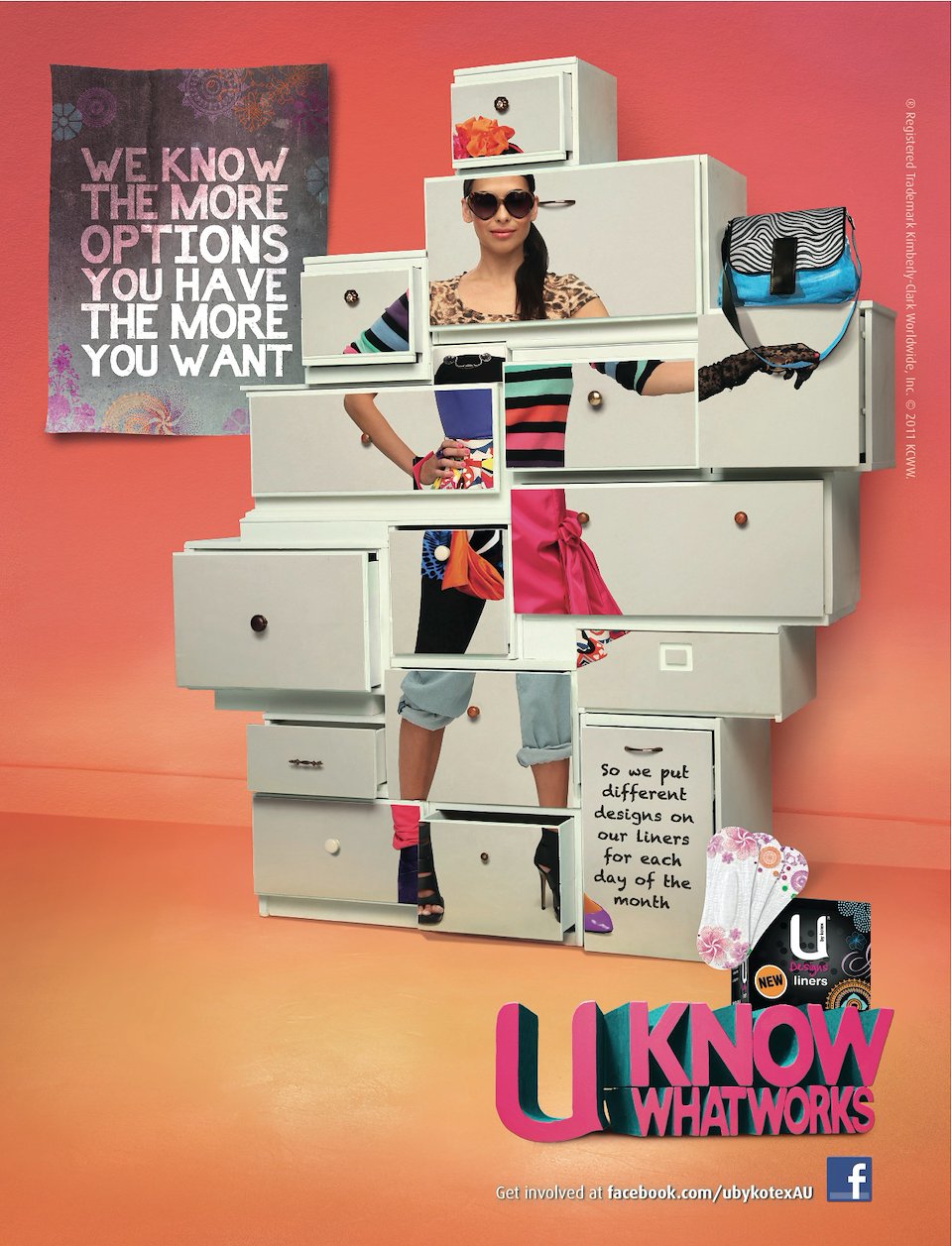U by Kotex was seen as a hip, young, yet rather superficial and gimmicky brand. It needed to reinforce its functional credentials. I wrote the tag line ‘U know what works’ which then became the creative platform for the entire campaign developed by the team at Shift.